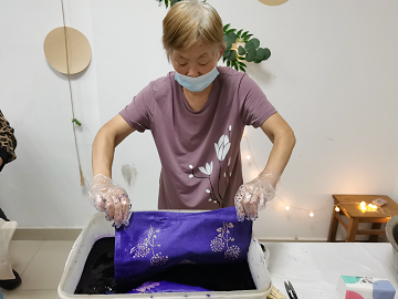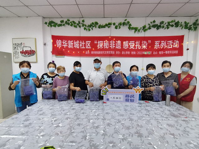 扎染古称扎缬、绞缬、夹缬和染缬,是中国民间传统而独特的染色工艺。 织物在染色时部分结扎起来使之不能着色的一种染色方法,中国传统的手工染色技术之一。 为了展现爱老、尊老、敬老、助老的良好社会风气,让锦华新城社区老年人感受到社区大家庭的温暖,增加生活娱乐色彩,特此举办“探秘非遗 感受扎染”系列活动。