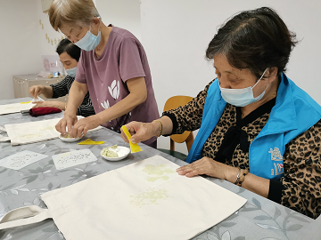 活动中,志愿者在老人了解扎染方法及会出现什么样的图案的基础上,引导老人尝试设计图稿,有计划地选择镂空板进行涂抹防染糊,注重培养老人在扎染活动中的有意性和计划性。他们在展示作品时都能主动地和图稿对比,体验到了设计、制作非遗文化带来的快乐。