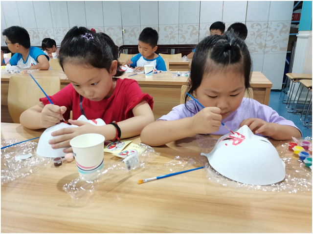“脸谱源于原始的图腾,最初用于祭祀,后来演变为表演艺术。”老师首先给大家普及了一些脸谱知识,接着介绍了京剧的来历,京剧脸谱的含义,并讲解了不同脸谱的色彩与性格。“红脸为忠勇,白脸为奸诈,黑脸表示勇猛,蓝脸表示重情义……”小朋友们听了直点头,原来京剧脸谱这么有意思。孩子们在磨具上先勾勒线条,再涂上颜料,色彩对比要强,脸谱绘画虽然只有几个步骤,但操作起来还是很难的,在立体的面具上勾勒线条想画好并不容易。孩子们大胆涂色,自由发挥,最终完成一件件面容各异的脸谱。
