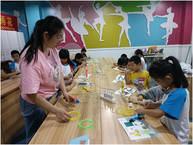 现场,一段3D打印的视频让同学们了解了什么是3D打印。老师详细介绍了3D打印的步骤及3D打印在医疗、文物保护、建筑、制造、食品等行业中的广泛运用,加深了孩子们对3D打印技术的认识。孩子们在老师的指导下兴奋地拿起志愿者准备的3D打印笔进行制作,有的对照模板,小心翼翼地描摹;有的按照自己的想像,大胆创作,将天马行空的想法,通过3D打印笔表达出来,从平面作品到立体作品,在志愿者的帮助下,他们不断尝试,最终完成了自己的作品。