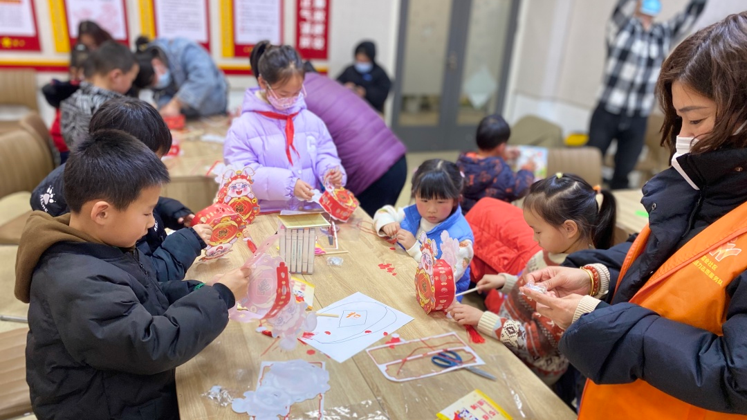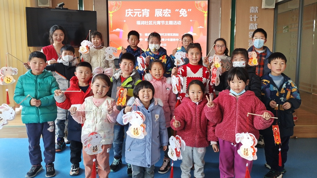 福润社区新时代文明实践站的社工正在为小朋友们讲解元宵节的来历和地方特色习俗。随后带领小朋友们进行了兔子纸灯笼的制作,小朋友之间互帮互助,经过折叠卡纸、拼接、穿线等步骤,一只只漂亮的、发光的兔子灯笼相继制作完成,小朋友们不仅了解了元宵节独特的节日内涵,也感受到了浓浓的节日氛围。
