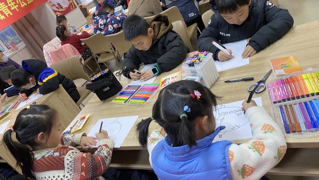 “绘制年画”环节,孩子们利用手中的彩笔,发挥自己的想象力进行涂色,一幅幅色彩艳丽的作品跃然纸上,火红的年画,缤纷的图画,节味十足。