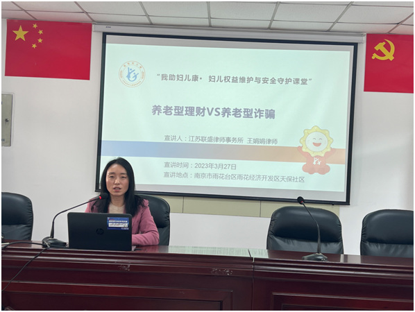 天保社区妇联邀请江苏联盛律师事务所的王娟娟律师于2023年3月27日下午在社区一楼会议室开展“养老型理财VS养老型诈骗”专题讲座,提高居民辨别身边各种养老类型诈骗骗局,捂住自己的养老钱袋子。