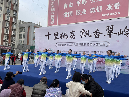 为进一步丰富社区居民文化生活,促进邻里融合。3月20日上午,由铁心桥街道政协工委、翠岭银河社区党总支、翠岭银河社区新时代文明实践站主办,铁心桥街道妇联、铁心桥街道团工委、铁心桥街道便民服务中心、铁心桥街道关工委、铁心桥街道新联会、铁心商会协办的“十里桃花 飘香翠岭”翠岭银河社区第九届邻里桃花节文艺汇演在社区广场成功举行。