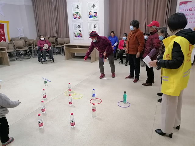 本次趣味运动会的比赛项目设置主要以低体力、趣味性为主,简单易懂,适合老人参加。运动会共设立了5个项目——“套圈、足式保龄球、你比划我来猜、企鹅散步、抛绣球”,现场热闹非凡、趣味十足。老人们个个摩拳擦掌,每项比赛都扣人心弦,精彩场面无处不在。参与的老人都有奖拿,最后,老人们高举奖品,愉快地合影留念。