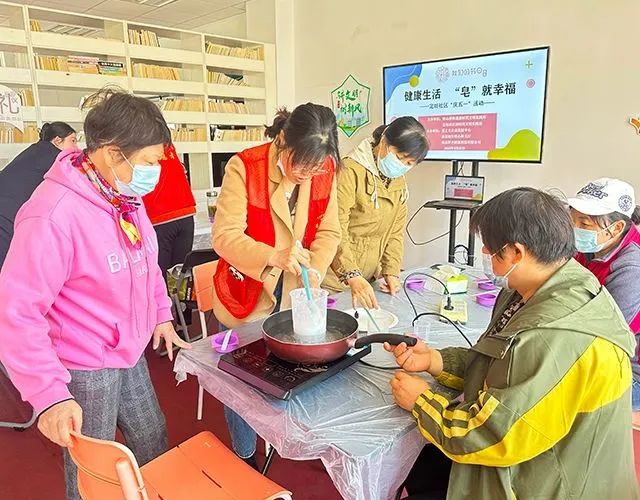 “大家看仔细了,我们第一步要先隔水融化皂基,这个步骤很重要,一定要慢慢来”看似简单的制作流程,更是增加了志愿者们的兴趣,大家都迫不及待的跟随着老师的步骤开始动起手来。从隔水融化皂基,到加入色素,再到倒入模具,最后脱模成形,每一步大家都小心翼翼地完成,不一会儿,一块块独一无二地手工皂就诞生了,现场飘散着满满的皂香与欢乐笑声。