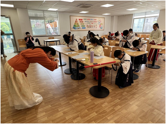 孩子们兴奋地穿上中华传统服饰—汉服,脸上洋溢着自信地笑容,听主持老师讲起了国学经典,主持老师用语言和行动诠释了中华“八礼四仪”,仪表、餐饮、言谈、待人、观赏、游览、仪式之礼,孩子们作为礼仪之邦的继承人,理应继承华夏礼仪。孩子们跟着老师诵读了“八礼四仪”三字经,学习了做揖礼,最后孩子们亲手制作了中药香囊,有的孩子赠送给老人,有的孩子赠送给了环卫工人,在这一环节中,孩子们学会感恩、懂得分享。