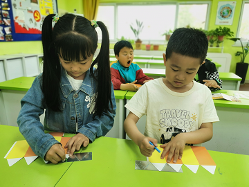 “为什么我们能看到世间万物呢?”;“是因为光线进入了我们的眼睛”;“不能发光的物体能被眼镜看到是由于反射了太阳、电灯等光源发出的光进入眼睛”。老师通过视频和图片引导,让孩子们知道了光的反射,“变脸万花筒”就是利用光的反射原理将分开的小鼻子小眼睛拼成一个个可爱动物头像的,孩子们拿到万花筒材料后,纷纷动手制作万花筒,在老师的指导下画三棱镜框架,小心翼翼地剪三棱镜,折叠固定万花筒,粘贴三棱镜,美丽的变脸万花筒在巧手下诞生了。瞧!我能在万花筒的锥形镜面上看到可爱的小动物头像啦,太神奇了吧!“这就是因为周围的图案经过平面镜反射成像而组成一个个完整的动物图案啦!”老师随即给孩子们解释道。