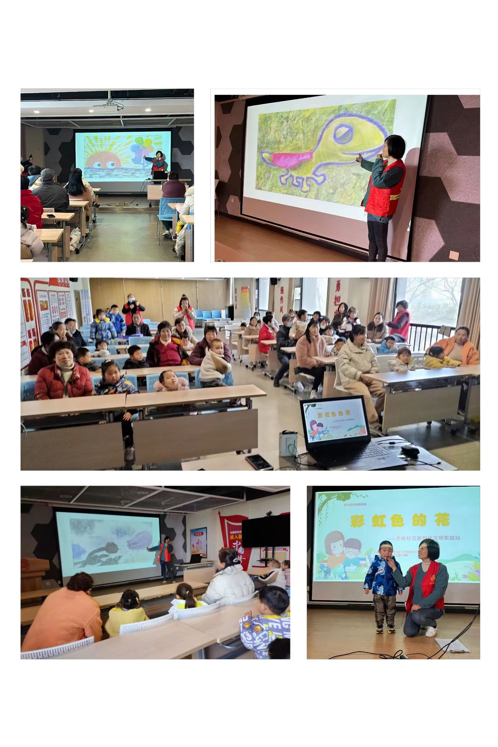 2月14日上午,齐修社区雨花麦田亲子阅读时光开展绘本阅读《彩虹色的花》。早春的一天,雪还没有化掉,在原野上突然开了一朵彩虹色的花。终于能见到太阳了,她十分高兴,由衷地愿意跟每个人分享自己的快乐。那彩虹色的花瓣,色彩是如此地动人,包含了我们所能想象的一切,生命、阳光、爱、梦幻……通过绘本让孩子学习乐于助人,乐于奉献的品质,获得是一种满足,给予是一种快乐,当你帮助别人的时候,你自身也会感觉到快乐,像彩虹色的花一样,无私地去帮助别人。