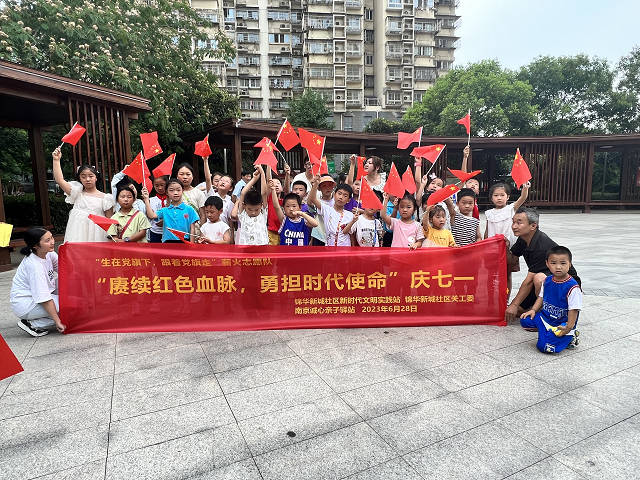 2023年6月28日,为庆祝中国共产党诞生纪念日—七一建党节,锦华新城社区新时代文明实践站,关工委联合南京诚心亲子驿站开展“生在党旗下,跟着党旗走”薪火志愿队——“赓续红色血脉,勇担时代使命”庆七一主题活动。