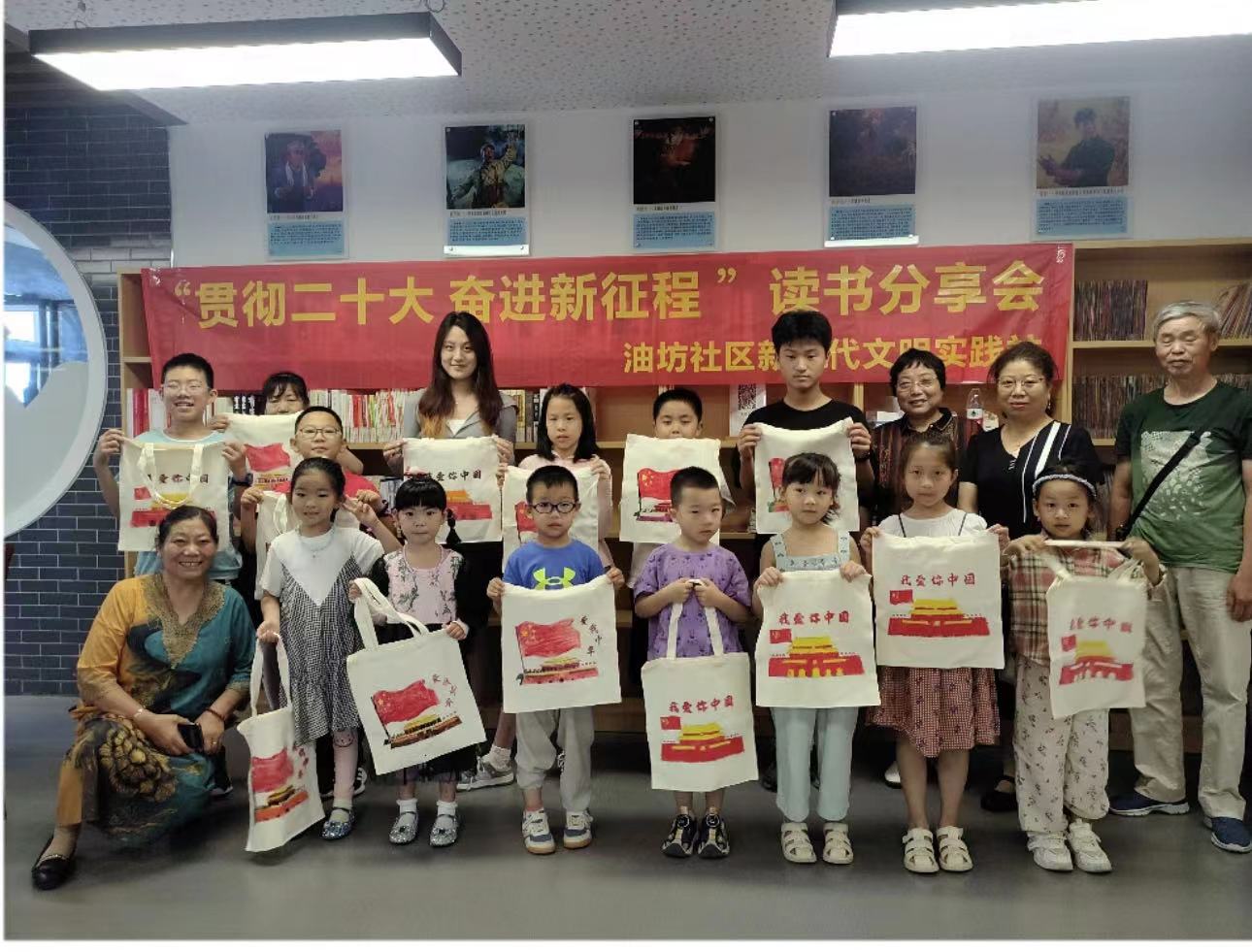 为学习贯彻二十大精神,激发广大群众的阅读热情,营造全民阅读氛围,7月5日,印象社会工作服务中心开展了以“贯彻二十大 奋进新征程”为主题的读书分享会活动。青少年分享红色书籍,大家一起重温革命先烈奋不顾身、保家卫国的崇高情怀,学习革命先辈矢志不渝、艰苦奋斗的红色精神。小朋友和家长还一起绘制了印有天安门、五星红旗图案的帆布包。读书分享会虽然落幕,但红色精神的传承却生生不息。红色经典阅读让每个人再次体会到了中华民族不屈不挠、勇于斗争的伟大精神,进一步激发了大家的爱国热情。