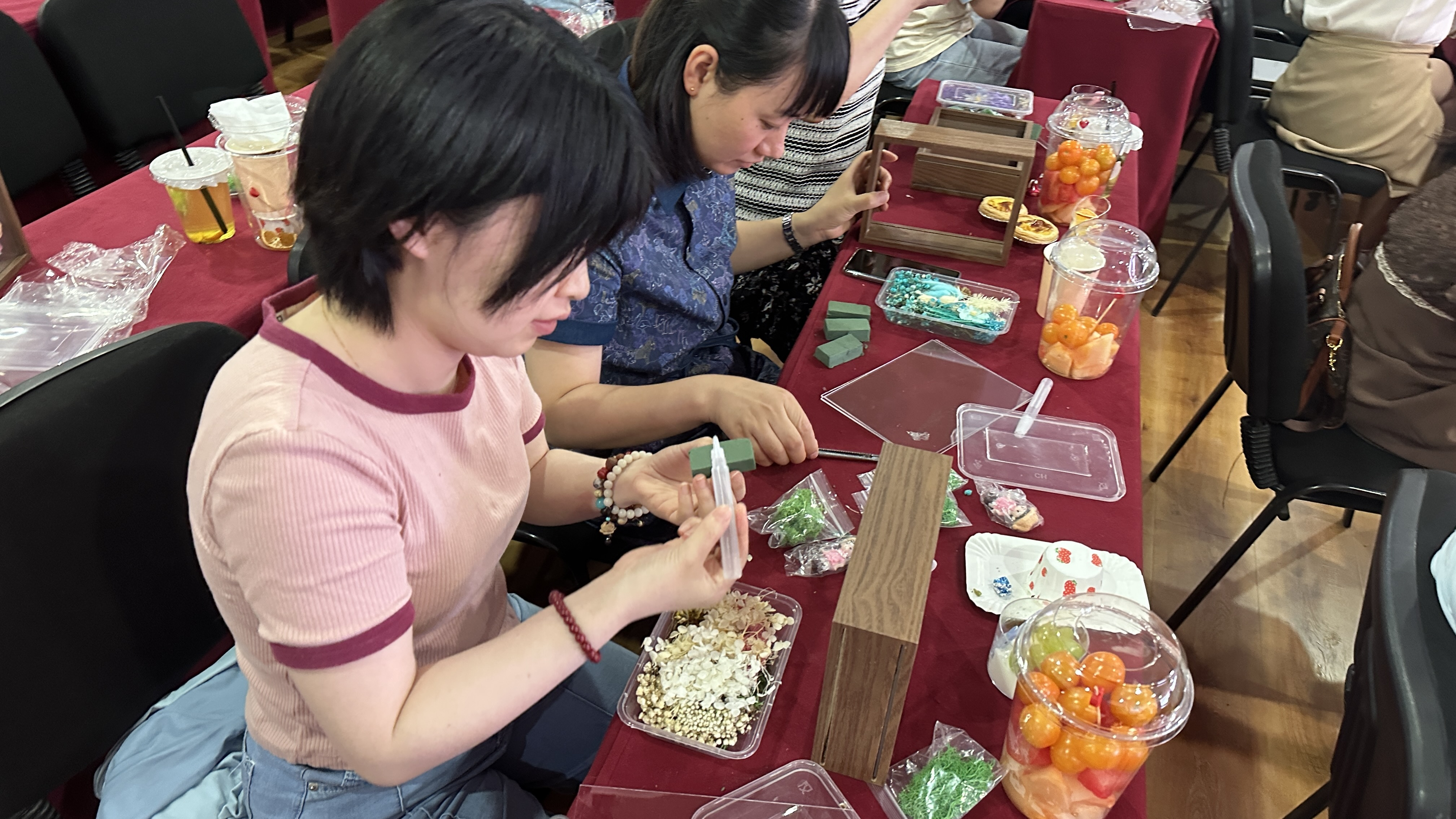 此次插花活动使用了永生花作为插花的主花,美丽的鲜花总是凋零的太快,留住美丽的事物是人们都追求的事,而永生花又被称为“永不凋零的花”,可以留住花朵最美丽的时刻,保持它最灿烂的时光。在一片温馨、浪漫的气氛中,大家互相交流插花技巧、传授经验,根据自己对美的认识,大胆地按照自己的创意和想法,用自己巧的双手,通过修剪、整枝搭配,将朵朵颜色形态各异的永生花组合成美丽的花束,变成了富有个性的艺术品。大家欣赏着自己手中独一无二的作品外,纷纷拍照分享。