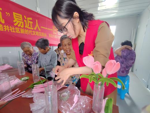 旧物改造体现着"低碳、绿色、环保"新生活理念,活动开始,社工为大家讲解了制作的步骤、要点和注意事项,随后,大家将扭扭棒通过折、剪、涂、粘等多种方式,制作成了精美的扭扭棒花束。不明白的居民相互讨论着,忙活着,使原本光秃秃的闲置瓶子罐子,经过大家的巧手改造都变了模样,一束束盛开的“鲜”花,让沉闷的房间焕发生机,大家摆弄着自己的作品妆点着原本不起眼的玻璃瓶子,都乐得合不拢嘴。