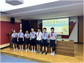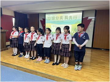 活动中红领巾小队员们分组上台进行垃圾分类宣讲,响亮的畅述了各自的环保宣言“环境保护在心中,垃圾分类在手中”、“绿色我先行”等口号,纷纷表示垃圾分类从我做起,认真做好垃圾分类,共创绿色环保的居住环境。