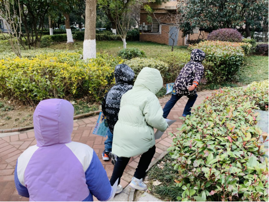 活动开始社工带领儿童了解社区相关知识,“大家知道我们社区管辖的小区有哪几个吗”,“对于同在一个社区的大家有没有发现我们身份证的前六位有一定的特征哦”,社工抛出几个问题成功的让大家对自己的社区有了新的认识;“我之前参加过社区的反诈宣传活动,了解到一些安全知识”,“我还参加过有腊八节活动”儿童争先恐后的表达引发了一连串社区宣传活动的回忆。社区小知识分享后,开启本次活动寻宝主题规则讲解。社工带领三小队儿童分别从石林大公园北门出发,按照个既定路线开始探宝。来到小区中央水景处,晴天,阳光水影映衬;雨天,飞檐挂水帘,更是别具一番风味;不知道还有没有小伙伴记得上月末的大雪,想必这湖中水榭亭台定是银装素裹,宛若画中景!在这里完成一场诗情画意大挑战吧。“水榭亭台,诗情画意”关卡考验儿童诗句积累,需要答出亭子相关词句。“亭亭玉立、十里长亭”“醉翁亭记”,儿童陆续答出亭相关的词句,在小小廊亭之下尽显风采。