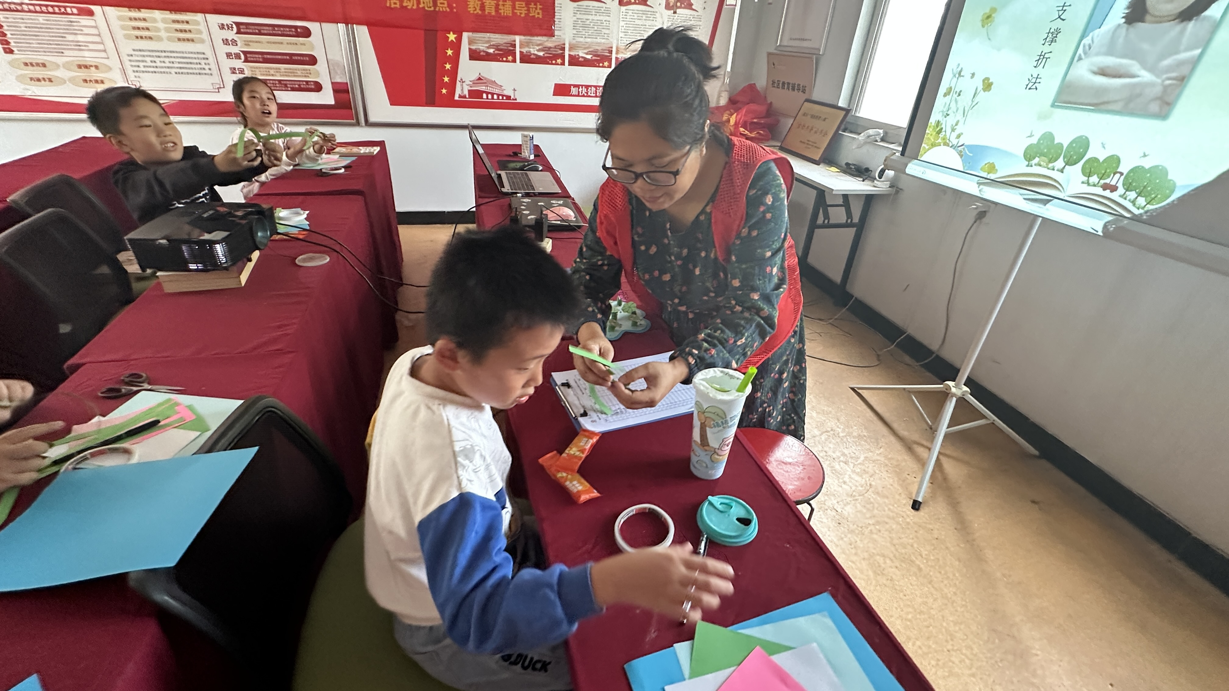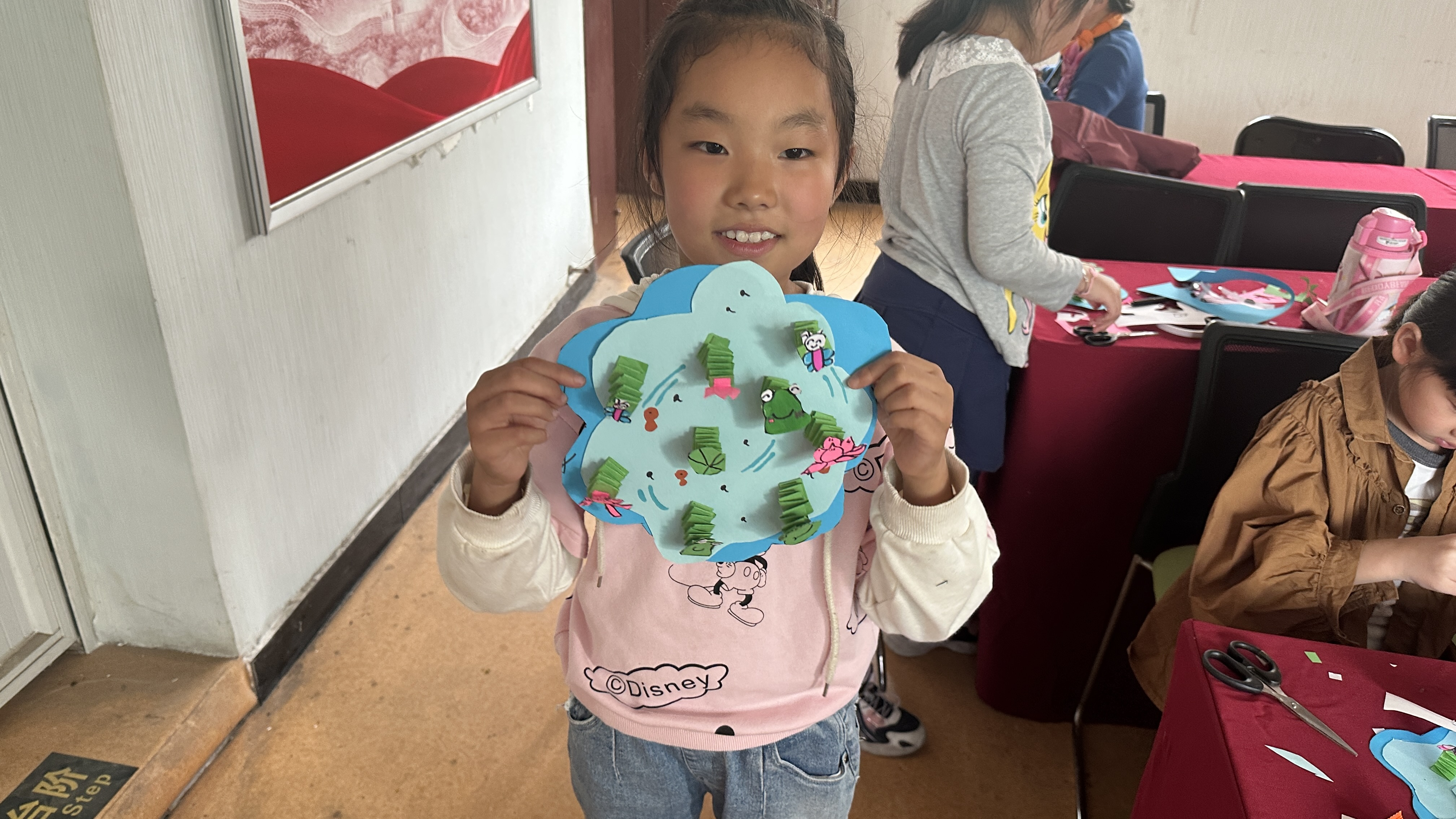 最后,社区志愿者带领孩子们做了一个小手工《快乐的小池塘》,孩子们积极认真的动手做起小手工。他们认真的画上可爱的图案,动手折纸、粘贴,一幅幅成品陆续完成,一个个充满“快乐的小池塘”就展现在大家眼前。