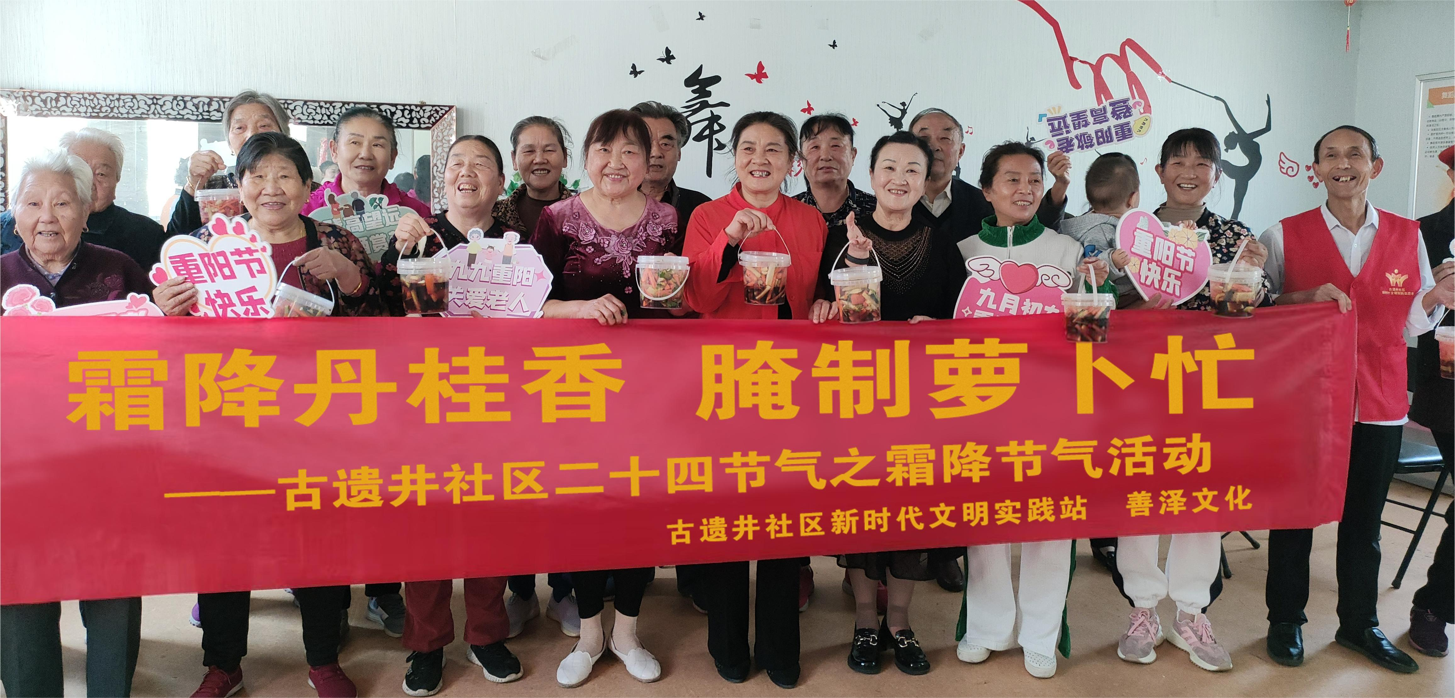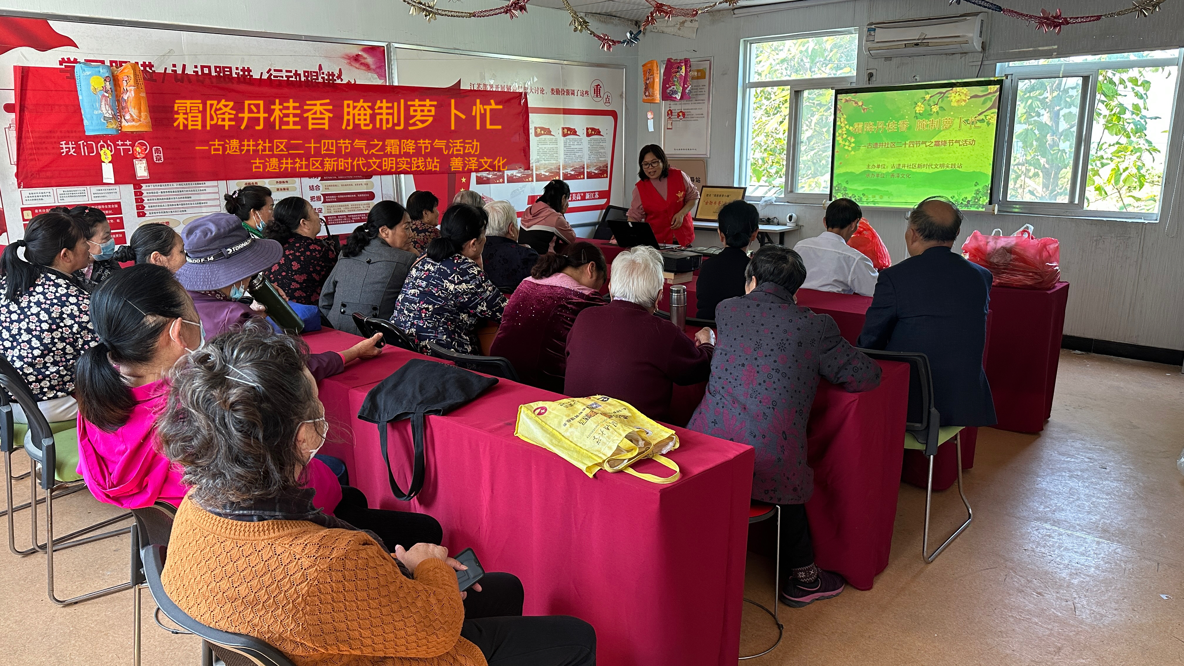 霜降时节正逢重阳佳节,为让社区居民感受传统的民俗文化和节气文化, 2023年10月24日,古遗井社区联合善泽文化在古遗井社区教育辅导站(悦心二楼)举办了“霜降丹桂香 腌制萝卜忙”——古遗井社区二十四节气之霜降主题活动。