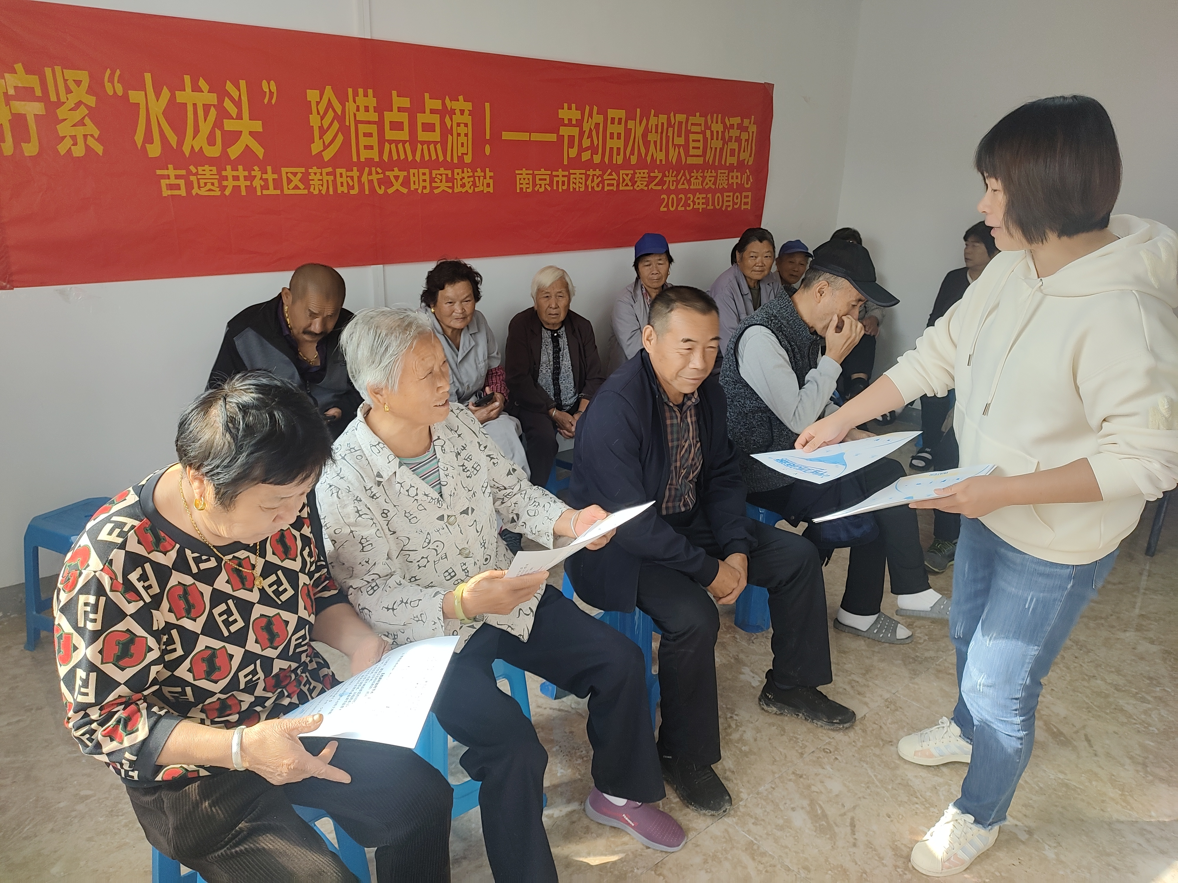水是生命之源,人可三日无餐,不可一日无水。为倡导科学用水理念,增强居民节水意识,养成节水习惯,11月9日,古遗井社区新时代文明实践站联合爱之光公益发展中心,在天保物业开展拧紧“水龙头”,珍惜点点滴!——节约用水知识宣讲活动,增强居民群众的节水意识,树立起节约资源的理念。