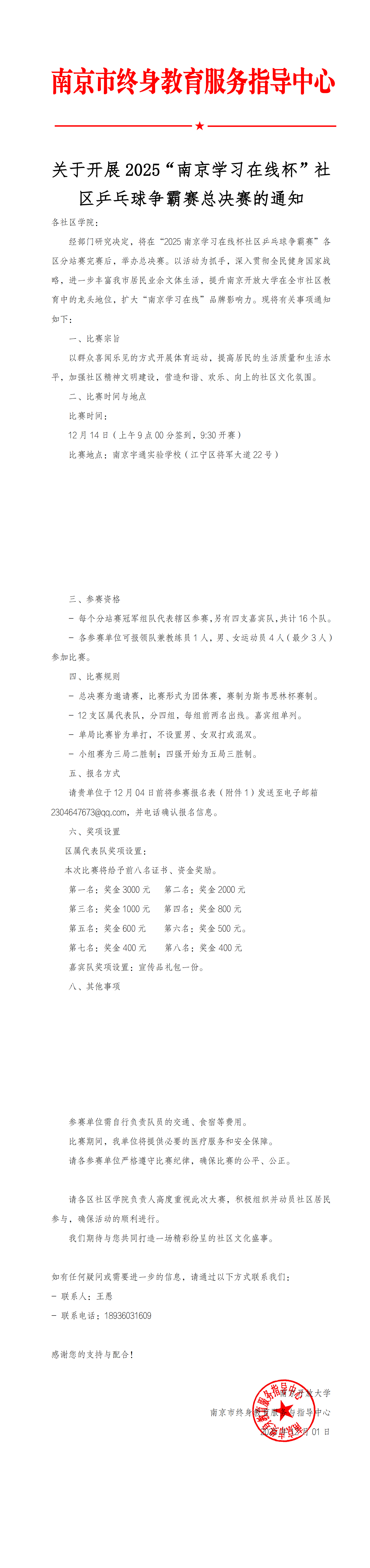关于开展 2025“南京学习在线杯”社区乒乓球争霸赛总决赛的通知