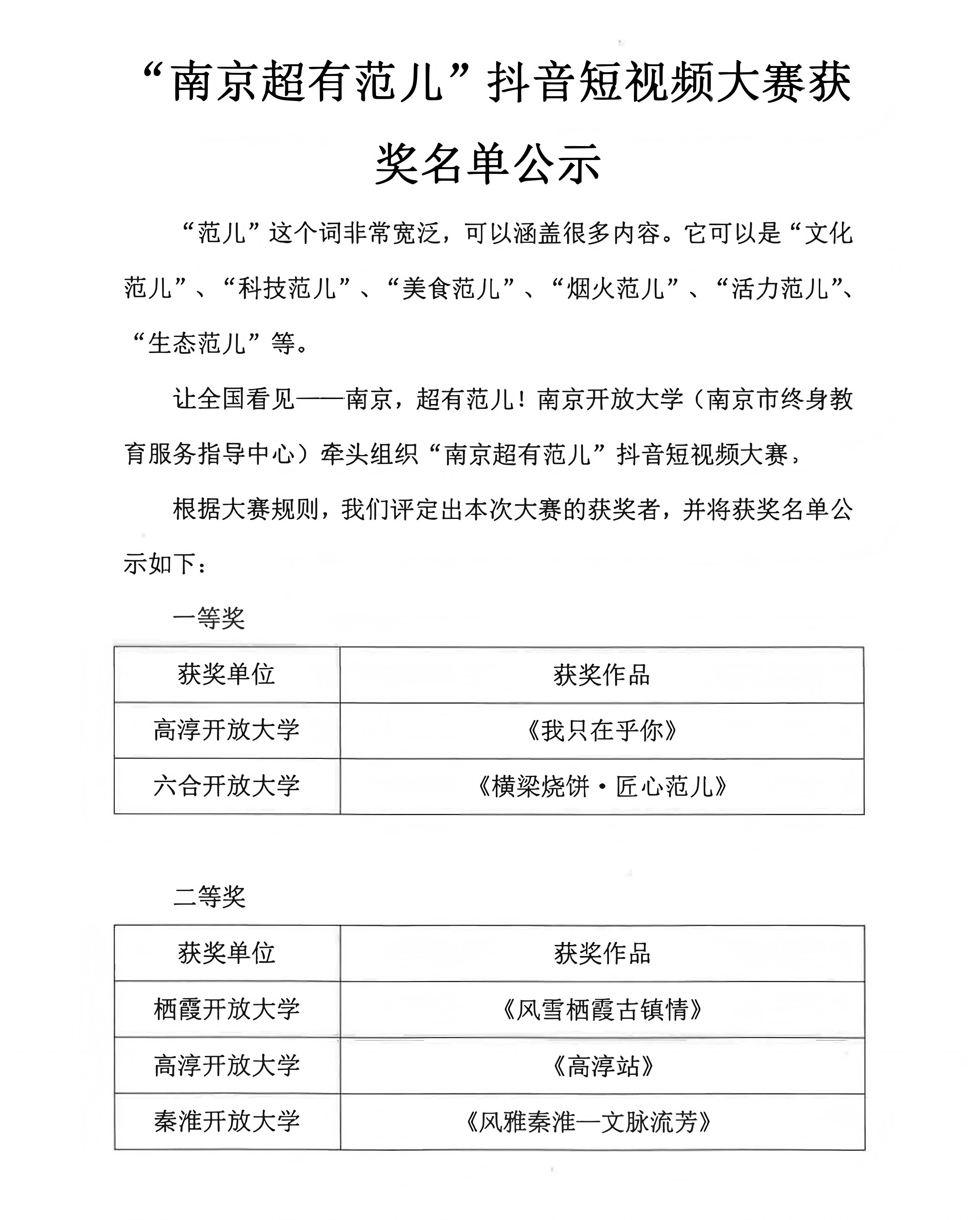 “南京超有范儿”抖音短视频大赛获奖名单公示